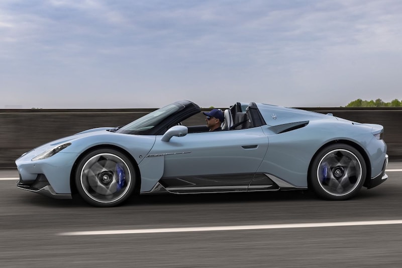 De Maserati MC20 Cielo is eindelijk helemaal en zonder camouflagemateriaal los. Hij heeft een mooi klapdaksysteem en draagt op het achterdek een enorme drietand met zich mee.