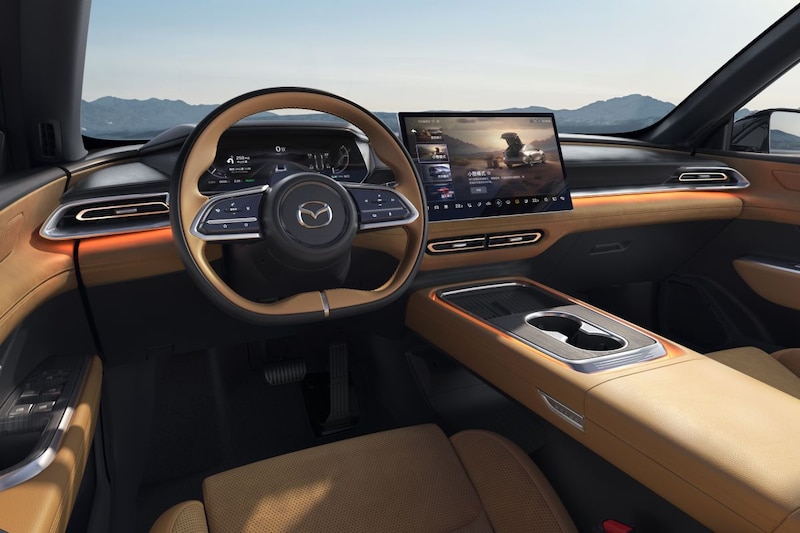 De Mazda EZ-6 is 4,92 meter lang, 1,89 meter breed en 1,49 meter hoog. Die afmetingen maken hem zo'n 5 centimeter langer dan de ter ziele gegane 6 sedan. Wat vormgeving betreft breekt de EZ-6 niet compleet met wat je al van Mazda kent. Wél hebben de ontwerpers van Changan-Mazda de auto bedeeld met strakkere lijnen. We zien platte, scherp getekende koplampen en ook een achterlichtpartij waarbij tijdens het schetsen ervan de liniaal ter hand is genomen. In de bilpartij is een actieve achterspoiler geïntegreerd. Ín de Mazda EZ-6 zien we naast fraai ogend leer en alcantara ook een fors 14,6-inch infotainmentscherm. Changan-Mazda spreekt van de aanwezigheid van sfeerverlichting met 64 instelbare kleuren. Een glazen panoramadak maakt deel uit van het Chinees-Japanse verwenfeestje.