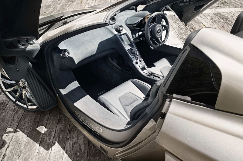 Aan de binnenzijde valt in de eeste plaats het grootschalige gebruik van alcantara op, al is er ook genoeg 'gewoon' leer te vinden. Ook hier zien we koolstofvezel accenten, terwijl her en der wat kleine onderdelen van een laagje blanke lak zijn voorzien. Een plakkaat met daarop de handtekening van McLarens hoofdontwerper Frank Stephenson geeft het geheel een nog exclusiever tintje.