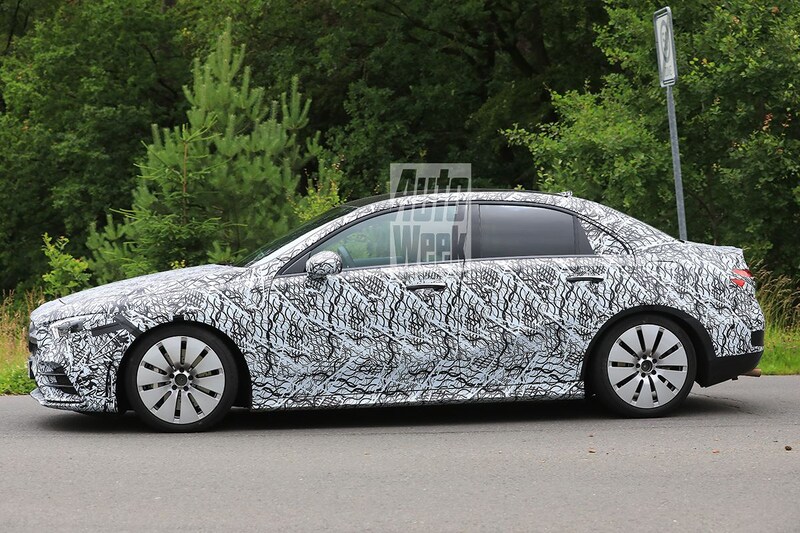 De A 45 krijgt gezelschap van een minder extreme variant, een auto die je kunt zien als de 43 AMG naast de 63 AMG's. Die voor de A-klasse nieuwe AMG-versie lijkt hier getest te worden in de eveneens nieuwe A-klasse Sedan. De aan weerszijden van de achterbumper geplaatste uitlaateindstukken wijzen er in elk geval op dat dit geen A 200 is. We zetten voor deze minder buitenissige AMG-versie in op een 2,0-liter viercilinder die zo'n 300 pk levert, een krachtbron waarmee de A-klasse auto's als de Golf R op de korrel wil nemen.