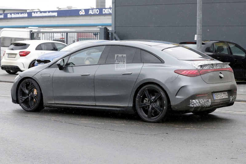 Aan de achterzijde vallen de diffuser met zes luchtgeleiders - ook weer hetzelfde aantal als op de EQS -, de spoilerlip op het kofferdeksel en de sleuven achter de wielkasten op als AMG-details. Ook de grote remschijven achter de wielen verraden het prestatiepotentieel van deze stekkeraar. Daarmee blijven de uiterlijke aanpassingen dus relatief subtiel. Van het interieur zijn geen beelden te zien, maar als AMG de lijn van de EQS ook daar voortzet, kun je rekenen op een AMG-sausje van onder meer sportstoelen en een sportstuurtje, sportpedalen en speciale vloermatten.