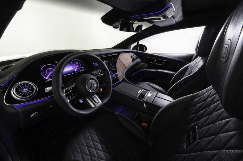 Brabus hangt de AMG-variant van de EQS uiteraard vol met lipjes, randjes en spoilers. Ditmaal zijn die niet alleen gericht op het verhogen van de neerwaartse druk, maar op het verbeteren van de wijze waarop de van nature al aalgladde EV door de lucht snijdt. Zo geeft Brabus de EQS een voorlip die de stabiliteit op hoge snelheid verhoogt, maar die ook minder luchtweerstand oplevert. Voor de achterwielen past Brabus visuele extraatjes toe die de luchtstroom verbeteren. Onder aan de achterkant zien we een diffuser en een achterspoiler die de EQS-op-stoom stabieler moet maken.