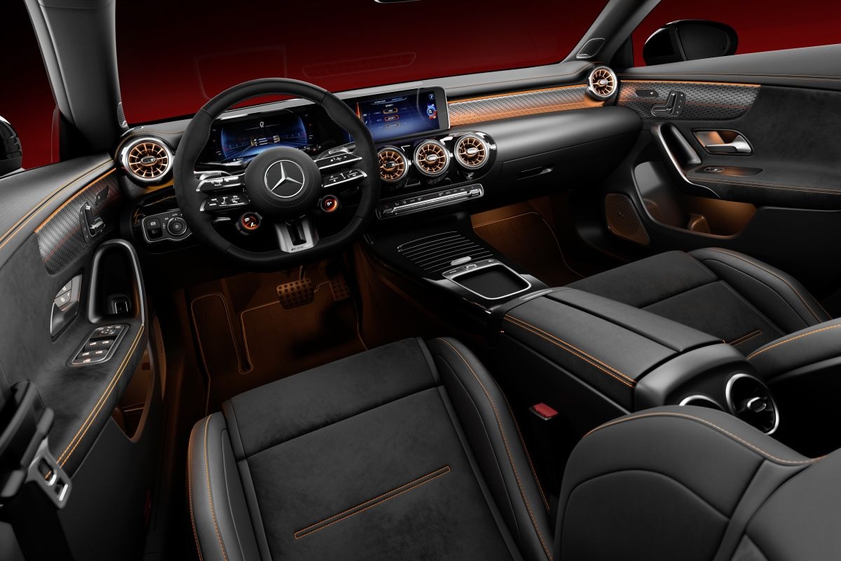 Het interieur van de Mercedes-AMG CLA 45 S 4Matic+ Street Style Edition, inclusief het nieuwe AMG-stuur.