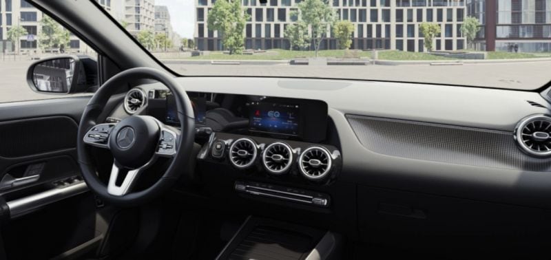 De automatische airconditioning kun je in de basisversie van de EQA alleen voor de hele auto instellen, niet voor verschillende zones. Daarbij kan de auto ook op afstand voorverwarmd worden. Gescheiden klimaatregeling is onderdeel van het Premium pakket, waarover later meer. De voorstoelen zul je handmatig moeten verstellen. Het zitcomfortpakket, met vijfvoudig verstelbare lendensteun, is inbegrepen. De stoelen zelf zijn bekleed in een combinatie van lederlook Artico en zwart stof. De dakhemel is eveneens in zwart stof uitgevoerd.
