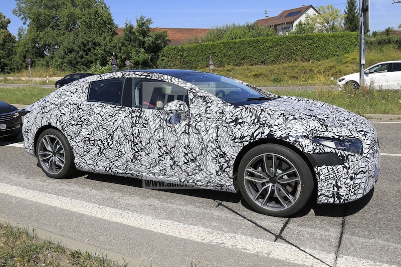 Opvallend is dat de daklijn bij dit testmodel vrijwel naadloos overgaat in de achterklep. De EQS lijkt geen sedan, maar een liftback. Gezien het formaat lijkt dit dan ook een Panamera-achtige auto. De neus is laag en voorzien van vlijmscherpe koplampen in de stijl van de A-klasse en CLS.