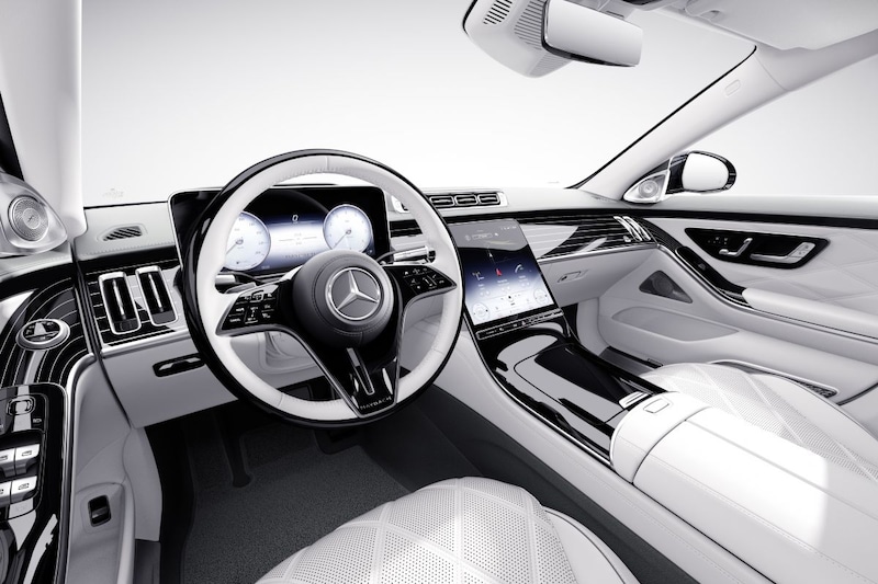 De twee modellen die momenteel op de markt zijn met de Maybach-naam erop, de S-klasse - de S680 met de V12 - en GLS, worden daarom uitgedost als 'Edition 100'. Zowel de S-klasse als GLS hebben een speciale met de hand aangebrachte two tone-kleurstelling, bestaande uit 'high tech silver' en 'nautical blue'. Ook staan de auto's op wielen die een niet eerder gebruikte grijze tint hebben. Op de C-stijl van de S-klasse en GLS vind je niet het standaard Maybach-logo, maar exemplaren waar 'Edition 100' onder staat. Eenzelfde embleem staat op de naafdoppen. Wie instapt in één van de twee luxe toppers heeft misschien wel wat baat bij een zonnebril, want het is vanbinnen grotendeels spierwit. 'Designo crystal white' om precies te zijn, dat is de basiskleur van de leren bekleding, aangevuld met 'silver grey pearle'-accenten.
