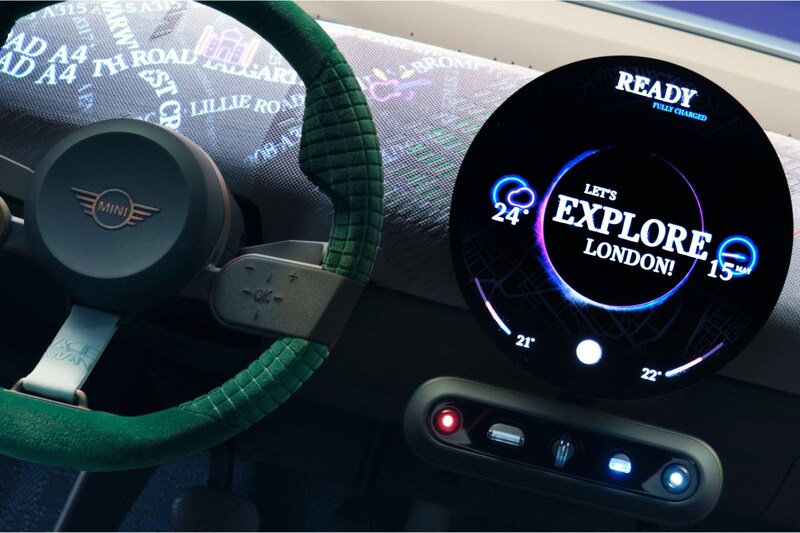 Volgens Mini kan er ook informatie over de gehele breedte van het dashboard geprojecteerd worden, van 'een gedetailleerde landkaart tot een wollige wolkenlucht'. Mini biedt je verder de mogelijkheid om te kiezen uit zogenoemde Experience Modes die invloed hebben op de lay-out en de kleurenthema's van het OLED-scherm en de projecties.