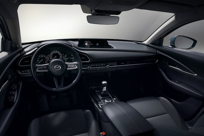 Mazda herziet zoals gezegd ook de standaarduitrusting van de CX-30. De cross-over heeft standaard voortaan geen in donkerblauw uitgevoerd kunstleer meer op de middenarmsteun en deurpanelen en ook het dashboard is niet niet meer standaard in die kleur uitgevoerd. Vanaf nu is de boel in het zwart afgewerkt. De Comfort-uitvoering heeft standaard een in het zwart afgewerkt binnenste, maar is optioneel met donkerbruin leer te krijgen. De elektrisch bedienbare achterklep is niet meer standaard bij de Comfort-uitvoering. De Luxury-uitvoering blijft helemaal zichzelf en is dus standaard voorzien van de donkerbruine interieurbekleding en de elektrisch bedienbare achterklep.
