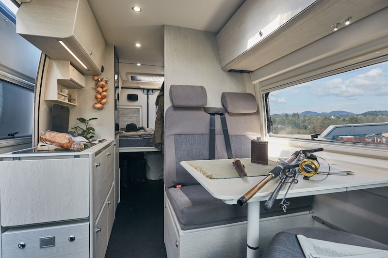 Standaard is hij uitgerust met een Webasto-standkachel, vloerverwarming en isolatie. Er zijn niet allerlei pakketten om uit te kiezen, want de Tourne is standaard al zeer rijk uitgerust. Cruisecontrol, mistlampen, navigatie, achteruitrijcamera, trekhaak, luifel met ledlicht en usb-aansluitingen, het zit er allemaal op. Net als een warmwaterboiler, douche en toilet, een volledig geïntegreerde keuken met zuinige compressorkoelkast, raamverduistering, een hordeur, een luifel en zelfs bijpassend bedtextiel. De Tourne heeft vier slaapplaatsen (vast bed en ombouw bank/tafel). Het achterste kun je eenvoudig wegklappen om bijvoorbeeld fietsen te vervoeren.