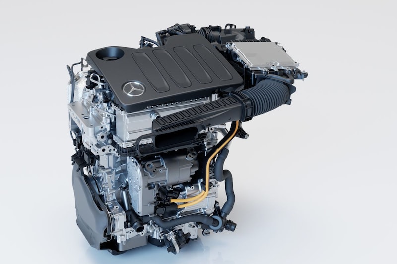 De hybride krijgt een 1.5-viercilinder-turbomotor, die onderdeel is van Mercedes’ modulaire motorenfamilie. Opvallend, want zou een modulaire 1,5-versie van de 3.0 zes-in-lijn geen driecilinder zijn? “Ja, goed punt, maar we vinden een driecilinder kwalitatief niet bij Mercedes passen”, aldus een technicus. “Dus hebben we een soort krimp uitgevoerd om er een viercilinder van te maken. Evengoed blijven heel veel onderdelen gelijk, dus we houden het schaalvoordeel”, zegt hij. De totale motor is bovendien kleiner dan de 1.5 die hij vervangt. Hij komt er met 136, 163 of 190 pk en gebruikt een Miller-cyclus voor een lager verbruik bij deellast. Hij wordt gekoppeld aan een gloednieuwe achttraps transmissie met dubbele koppeling. Of eigenlijk een driedubbele koppeling, want in deze automaat zit een elektromotor met 27 pk geïntegreerd. Door die extra koppeling kan de auto ook volledig elektrisch rijden. “Let op, want wat ons betreft is rijden meer dan alleen je auto parkeren”, doceert de motor-engineer. “Met die 27 pk kun je opvallend veel kilometers afleggen in de stad of de auto op snelheid houden op een buitenweg.” Het gecombineerd vermogen van de hybride zal uiteraard hoger zijn dan enkel het benzinevermogen, maar lager dan de twee vermogens bij elkaar opgeteld. De exacte getallen heeft Mercedes echter nog niet. Het 48-volt-systeem krijgt zijn kracht van een compacte 1,3 kWh-accu die onder de bestuurdersstoel ligt.