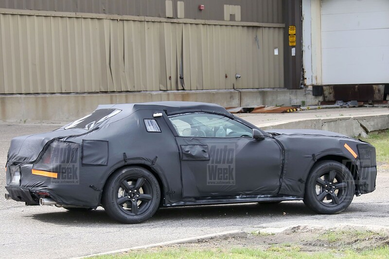 Als we een beetje voorbij de vuilniszakken om de koets kijken, kunnen we vaststellen dat de komende Mustang ongeveer dezelfde proporties en uitstraling zal krijgen als het model dat hij opvolgt. De lange neus blijft natuurlijk, waarbij naast hoekige vormen opnieuw een prominente grille valt te onderscheiden. Ford probeert ons op het verkeerde been te zetten door onnodig materiaal onder de camouflage op het dak te stoppen, zodat we de echte daklijn nog niet kunnen zien, maar op de beelden van de zijkant is al duidelijk zichtbaar dat de aanstaande ponycar opnieuw een daklijn krijgt die vloeiend over loopt in een dikke derrière. En dat is natuurlijk precies hoe we het willen bij een auto van dit kaliber. Subtiele lijnen laten we wel lekker over aan andere modellen...