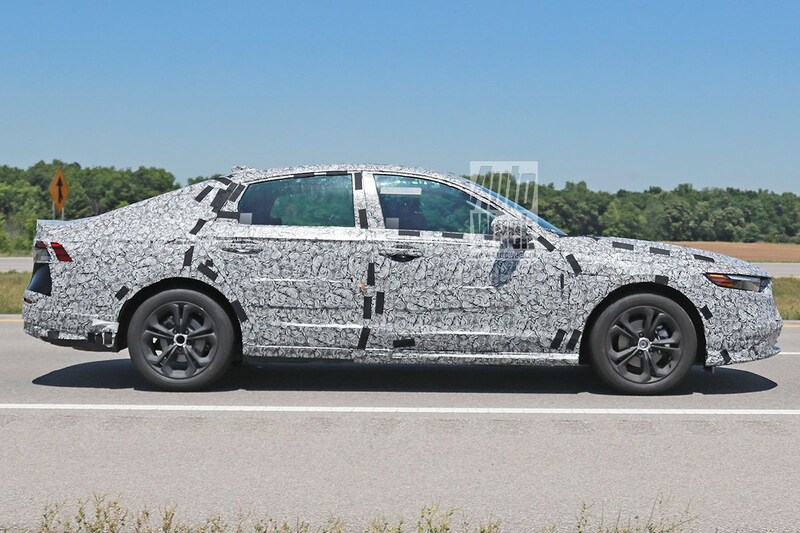 De huidige in 2017 gepresenteerde generatie Accord werd onlangs op subtiele wijze vernieuwd, maar duidelijk is dat zijn opvolger trouw blijft aan de basisvorm van het huidige model. We zien een gestrekte sedan met een vanaf de B-stijl al vrij rap aflopende daklijn. De nieuwe Accord lijkt minder een 'hangkont' te krijgen dan het model dat nu nog de Honda-showrooms bevolkt, al is het mogelijk dat het camouflagemateriaal voor wat ruis zorgt. De achterlichten lijken voor het eerst in de Accord-geschiedenis met elkaar verbonden te worden en daarmee volgt de Accord trouw de voorschriften die het Grote Handboek Autodesign lijkt te geven.