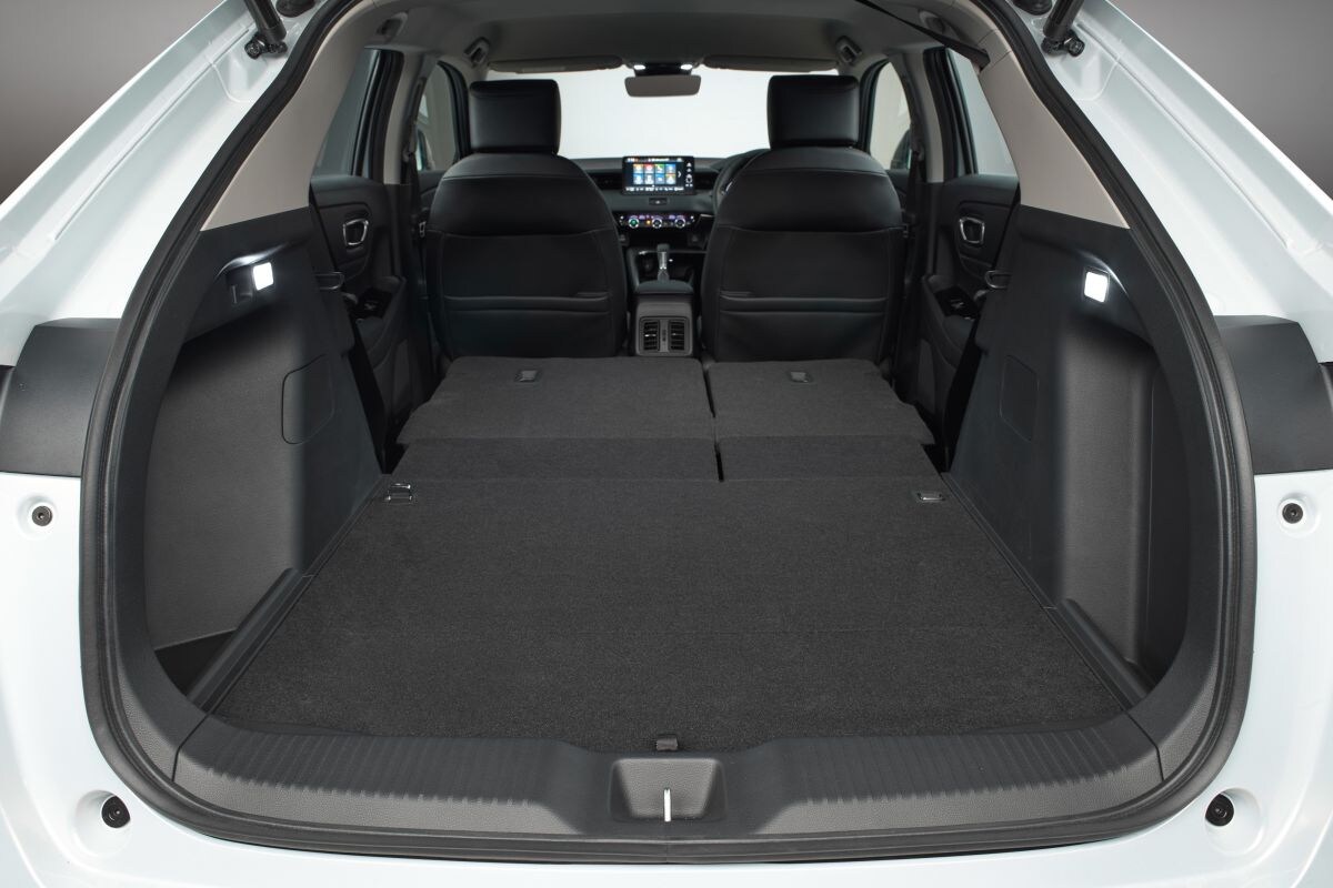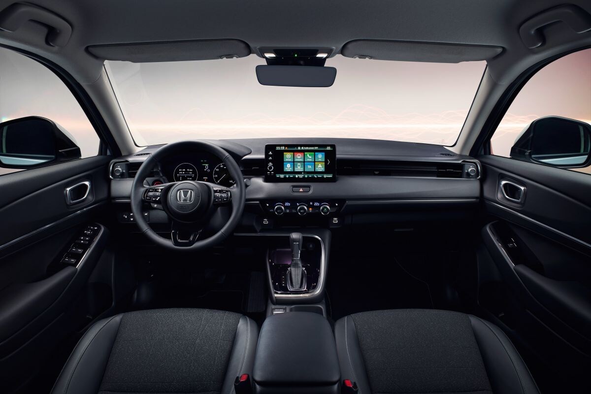 De werkplek is helemaal van deze tijd. Het interieur is relatief minimalistisch vormgegeven. De ventilatieroosters zijn in een horizontale strook in het dashboard weggewerkt en centraal op de middenconsole staat een 9-inch display dat bij het infotainmentsysteem hoort. Het systeem kan overweg met Apple CarPlay (draadloos) en Android Auto (kabel). Eronder zit een subtiel knoppeneiland voor de bediening van de klimaatregeling. Achter het stuurwiel zit een 7-inch tft-scherm. De HR-V krijgt dezelfde slimme Magic Seats als de Jazz en dat betekent dat de achterbank neerklapbaar is, maar dat het geheel ook omhoog te klappen is. Volgens Honda kunnen twee mountainbikes er (zonder voorwiel) naast elkaar in, best een prestatie. Een slimme optie is de Power Tailgate Walk Away Close-functie. Hierbij detecteert de auto de nabijheid van de autosleutel. Als je met de sleutel wegloopt van de geopende achterklep, sluit de HR-V zijn achterste automatisch.