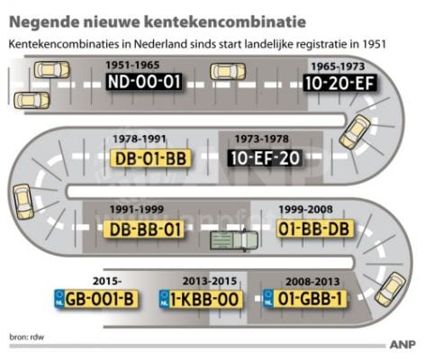 Met deze volgorde van letters en cijfers zijn ongeveer 2,8 miljoen kentekens mogelijk. De RDW, die over het wegverkeer gaat, verwacht dat de combinatie ongeveer vijf jaar meegaat. Daarna stappen we over op G-001-BB.