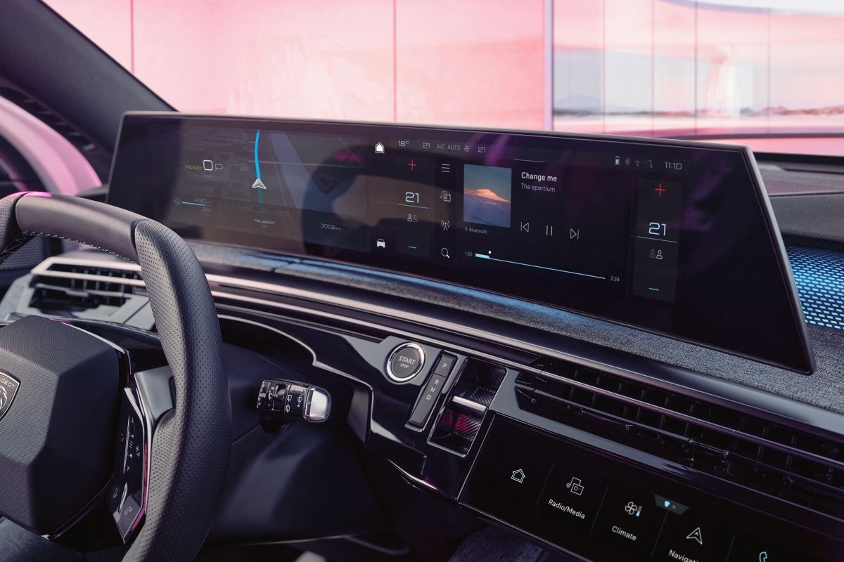 Peugeot houdt uiteraard ook vast aan het i-Cockpit-principe, maar vult dit wel anders in. Zo lijkt er nu een schermcombinatie voor het dashboard te ‘zweven’, omdat het ophangpunt voor de inzittenden niet zichtbaar is. Standaard gaan achter één gebogen glasplaat twee 10-inch schermen schuil, maar bij duurdere uitvoeringen is het optisch daadwerkelijk één ononderbroken 21-inch scherm. Met een aanraakgevoelig gedeelte in het midden en een instrumentarium-stuk ter hoogte van het stuur, dat wel. Het lager geplaatste, extra ‘touchscreen’ uit de 308 keert hier ook terug, maar is wel verbeterd. Dit i-Toggles-scherm met snelkoppelingen laat zich nu naar links en rechts swipen, zodat er nog meer functies snel bereikbaar kunnen worden gemaakt. Het hele infotainment is nog wel gebaseerd op dat van de 308, 408 en andere recente Stellantis-producten, maar dan beter en vooral sneller. Gelukkig, want dat kon geen kwaad.
