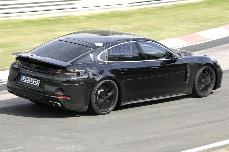 Aan de achterkant springen de wijzigingen wat meer in het oog. De nieuwe Porsche Panamera krijgt beduidend plattere achterlicht achterlichten, die over de hele breedte van de kont visueel aan elkaar verbonden zijn met een zwart vlak. Mogelijk zit daar, net als bij de huidige Panamera, ook weer een lijn ledverlichting over de hele breedte.