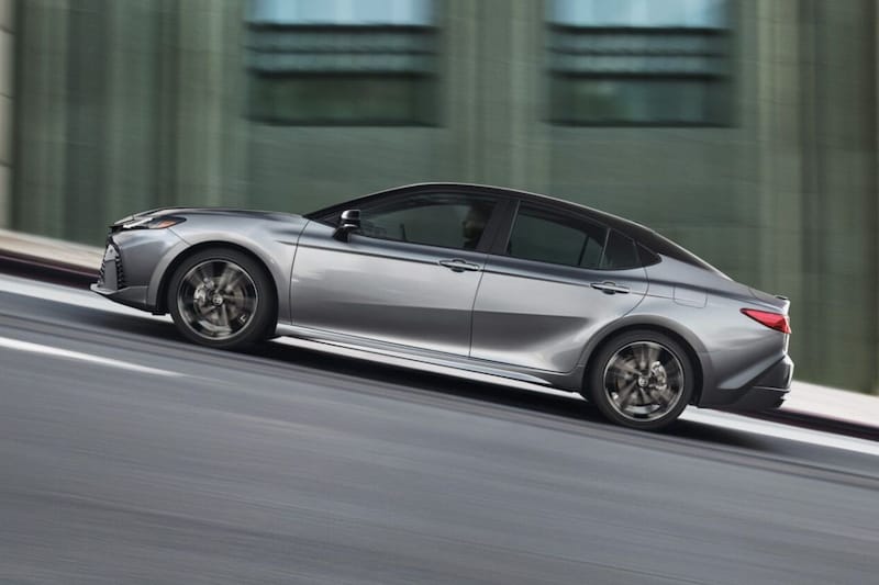 Hoewel het silhouet van de nieuwe Toyota Camry sterk lijkt op dat van de huidige is het model toch echt vooral nieuw. Kijk maar eens naar de vorm van de raampartij en de vorm van – met name – de achterportieren. Als dergelijke zaken onveranderd blijven, gaat het meestal om een model dat een doorontwikkeling is van zijn voorganger, maar dat is hier dus niet het geval. De nieuwe Camry heeft C-vormige koplampen die enigszins doen denken aan de exemplaren van de Prius en draagt een brede grille onder aan het front. Het deel tussen de koplampen is relatief dicht en ook daarmee sluit de Camry optisch aan bij auto's als de nieuwe Prius, Crown en zelfs de bZ4X.