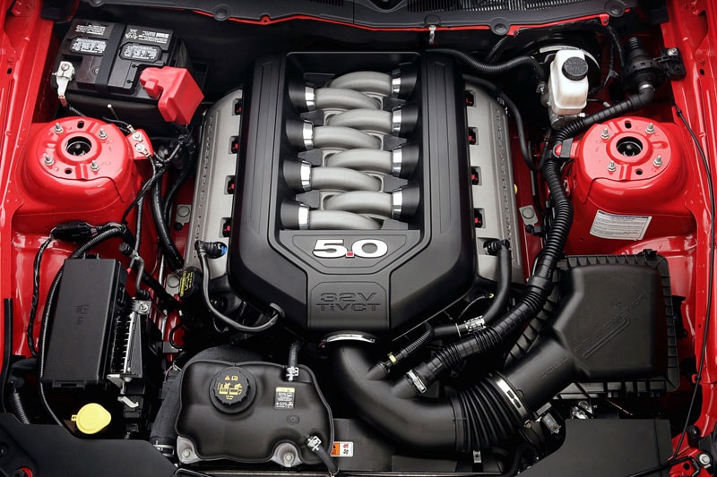 De nieuwe Mustang V8 heeft een cilinderinhoud van 5,0-liter. Voor Amerikaanse begrippen is het een zeer modern blok met variabele kleptiming. Het vermogen is 412 pk en het maximumkoppel is 530 Nm. Dat is bijna 100 pk en 90 Nm meer dan de 4,6-liter V8 mobiliseerde. De nieuwe vijfliter is 20 procent lichter dan z'n voorganger