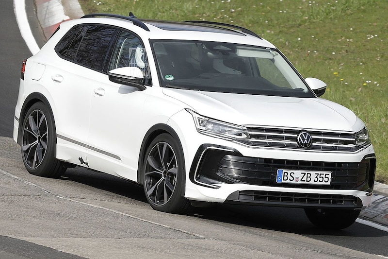 Voor het eerst zien we de nieuwe Volkswagen Tiguan met R-aankleding voorbij komen. Het zwarte exemplaar op de foto's bij dit artikel is duidelijk wat dikker uitgevoerd dan de witte Tiguan. De nieuwe Tiguan krijgt van zichzelf al een behoorlijk stevig smoelwerk dankzij flinke luchtinlaten in de voorbumper, maar daar doet het R-pakket nog een schepje bovenop. De bumpers zijn bovendien onderaan wat hoekiger van vorm en verder zien we wat andere dorpels en opvallende nieuwe lichtmetalen wielen. Aan de achterkant treffen we alleen stickers die op sportieve uitlaateinden moeten lijken, de werkelijke uitlaat zit echter goed verscholen. We hebben hier zeer waarschijnlijk met een bescheiden Tiguan met R-line-aankleding te maken, niet met een Tiguan R. Het is nog even de vraag of de Tiguan R een vervolg krijgt. In Nederland is die niet leverbaar en het is maar zeer de vraag of daarin verandering komt.