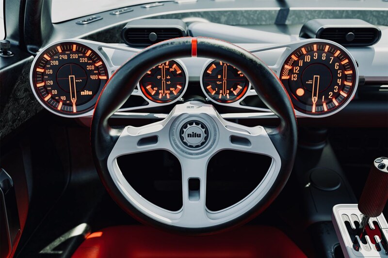 Waar Koenigsegg elektrificatie al jaren geleden heeft omarmd en ook Bugatti dat tegenwoordig doet, blijft de Nilu heel ver bij elektrokracht uit de buurt. Sterker nog: de Nilu wil ook niets weten van zaken als elektrificatie 'en technologische hulpjes' en moet een 'ongefilterde en rauwe' ervaring bieden. Wat hij te bieden heeft? Heel wat. De Nilu is gebouwd rond een uit koolstofvezel vervaardigde monocoque, heeft uit aluminium vervaardigde subframes en een V12 die meer dan 1.000 pk levert.