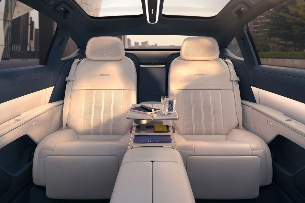 Dat is vanbinnen wel anders. De Nio ET9 lijkt in alles gericht op luxe directievervoer en heeft vier riante zitplaatsen en een enorme middenconsole, die als een soort brug van voor naar achteren door het interieur loopt. Achterin voorziet die ‘brug’ onder meer in extra opbergvakken, telefoonladers en klaptafeltjes. Ook zijn er grote schermen aangebracht op de rugleuning van de voorstoelen, zodat werk en privé vanaf de achterzetels op een zo praktisch mogelijke manier kunnen samensmelten.