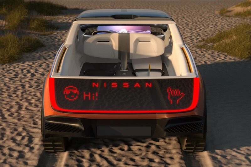 Het eerste nieuwe studiemodel heet Chill-Out en is naast de meest concrete ook direct de meest conventionele van het viertal. Nissan omschrijft de Chill-Out als zijn Next Generation Cross-over EV. De auto staat op het CMF-EV-platform waar de nog op de Nederlandse markt te verschijnen Ariya gebruik van maakt. De SUV met een sterk aflopende daklijn heeft een herkenbaar Nissan-front, al is de concrete invulling ervan volledig nieuw. Net als de EQ-modellen van Mercedes-Benz heeft de Chill-Out een neus met een zwart masker waar de verlichting min of meer in is verborgen. Ook aan de achterkant van de showauto zien we een dergelijk zwart paneel waarin de verlichting is verwerkt. Het interieur van de elektrische SUV geeft een voorproefje van het binnenste van een volledig autonome auto, compleet met voetenbankje voor de voorpassagiers en een enorm infotainmentscherm.