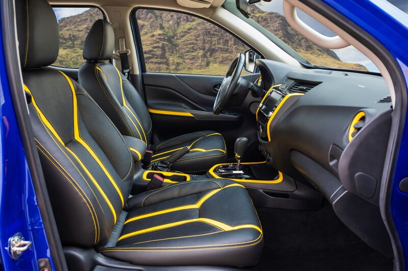 Ook het interieur is opgefleurd met felgele accenten. Het opvallendste kenmerk van deze auto is echter dat er een stroomvoorziening aan boord is in de vorm van twee Leaf-accupakketten. Deze bevinden zich in de bak en kunnen worden gebruikt om allerlei hulpmiddelen van stroom te voorzien.
