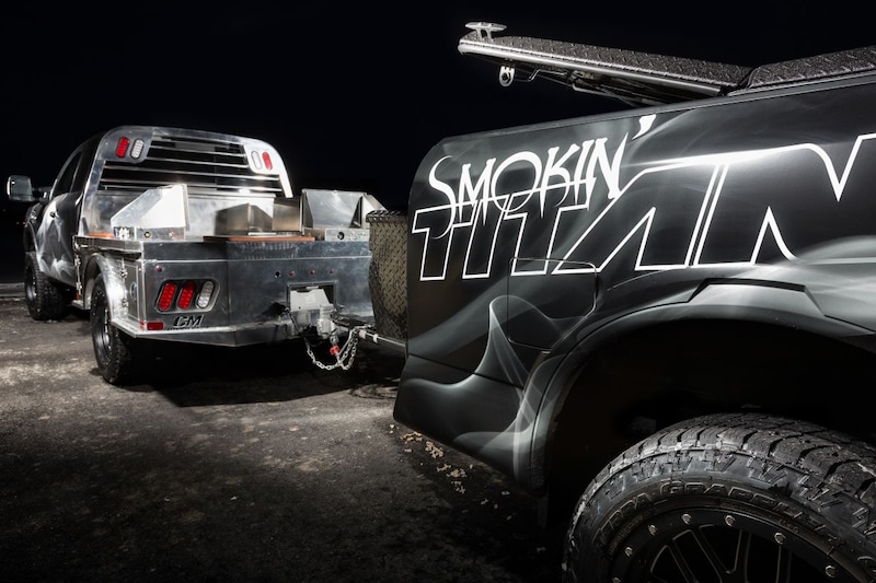 Naar de grootste beurs voor werkvoertuigen neemt Nissan dit bijzondere gevaarte mee. Is het wat we denken dat het is? Jazeker. Nissan trekt de laadbak van de Titan, monteert er een barbecue in en hangt het geheel vervolgens áchter de Titan. Juist, als aanhanger. Reden hiervoor is dat de temperatuur van de barbecue tot 600 graden kan oplopen. Omwille van de veiligheid is het geheel achter de auto gehangen.