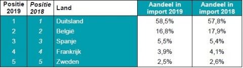 In tegenstelling tot in 2018 nam de import van occasions vorig jaar af, en wel met 4,6 procent tot 216.689 exemplaren. De daling valt ten dele te verklaren door de grote occasionvoorraden die Nederlandse autobedrijven momenteel zelf hebben staan. Uit Duitsland werden de meeste gebruikte vandaan gehaald, maar liefst 58,5 procent van alle geïmporteerde occasions groeide op bij onze Oosterburen.