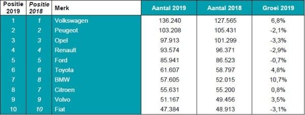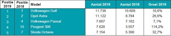 Op modelniveau is het eveneens Volkswagen dat de verkooplijst aanvoert. De Golf staat met 45.971 verkochte exemplaren (+4,9 procent) op de eerst plek, gevolgd door de Polo met 43.491 verkochte auto's (+8,5 procent). Op plek drie staat de Opel Corsa, een auto waarvan er 6,5 procent minder werden verhandeld tussen autobedrijven en consumenten. Ook hier geldt dat nagenoeg de complete top tien gelijk is aan die van 2018. Hier zijn het de Ford Fiesta en de Opel Astra die van plek wisselen en eindigen op respectievelijk de zesde en zevende stek. Ook de BMW 3-serie en Peugeot 206 doen een stoelendans en sluiten 2019 af met respectievelijk een achtste en negende positie.