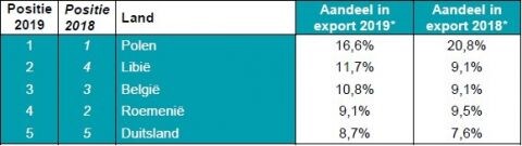 Net als de verkoop van gebruikte auto's aan consumenten, nam ook de export van occasions in 2019 toe en wel met een vrij heftige 14,6 procent. In totaal verloren 303.524 auto's hun Nederlandse verblijfstitel. Ook in 2017 nam de export al fors toe en wel met 11,8 procent. Zowel oudere als jongere modellen werden vaker naar het buitenland verscheept. Een deel van deze groei is te verklaren door een groot aantal relatief jonge auto's dat terugkwam uit de lease. Daarnaast deden autobedrijven oudere modellen van de hand waarnaar volgens VWE Automotive in Nederland minder vraag is. Hoewel Polen nog altijd de populairste eindbestemming is voor occasions, nam de export naar dat land wel af. 16,6 procent van de geëxporteerde auto's ging naar Polen, terwijl dat aandeel in 2018 nog op 20,8 procent lag. Libië is na Polen de populairste eindbestemming van een gebruikte auto (aandeel 11,7 procent), terwijl het land vorig jaar op plek vier stond. België staat net als in 2018 op de derde plek, gevolgd door Roemenië (2018 op plek twee) en Duitsland.