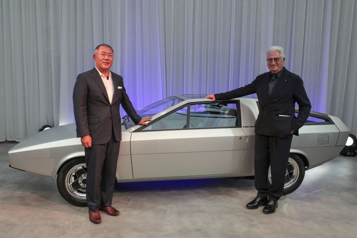 In de aanloop naar de 'ponydag' die Hyundai volgende week organiseert in het Zuid-Koreaanse Seoul trekken de Koreanen vandaag het doek van hun opnieuw gemaakte Hyundai Pony Coupé Concept uit 1974. Dat doen ze samen met de ontwerper ervan – Giorgetto Giugaro – in Italië, het land waarin de auto in 1974 voor het eerst de spotlights pakte.