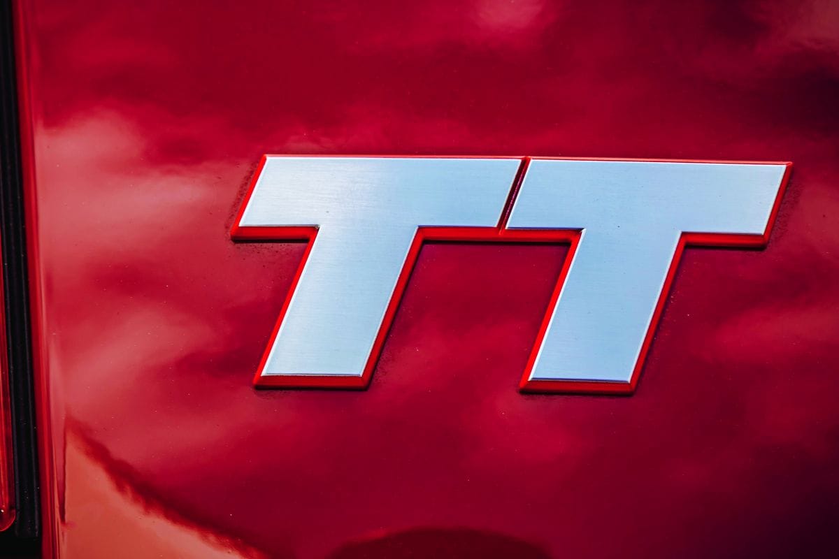 Of zie het designthema met de acht punten. Op de ventilatieroosters, op de tankdop, op de portierhendel aan de binnenzijde, op de bedieningsknoppen: overal zien we acht inkepingen. Bijna geen enkel onderdeel dat je kon zien was afkomstig uit andere modellen, behalve misschien de hendels aan de stuurkolom. En ook bijna de naam. “Oorspronkelijk was het plan om de auto de A3 Coupé te noemen”, zegt Schreyer. “Stel je voor!” Dat was echt geen optie voor de ontwerper. Zodoende bedacht hij op de terugweg van Wenen naar Ingolstadt tijdens een zakelijke trip de naam TT. Schreyer: “Ik heb altijd van dubbele letters in een autonaam gehouden, misschien omdat ik de Ferrari 512 BB zo mooi vind.” Terwijl hij in zijn huurauto reed, ging hij in gedachten door het alfabet. Achteraf kunnen we zeggen dat het een gelukstreffer was dat hij na de letter ‘A’ gewoon doorging en pas bij de ‘T’ stopte. “TT klonk goed en bovendien werd die typeaanduiding al een keer gebruikt voor een NSU”, zegt hij.