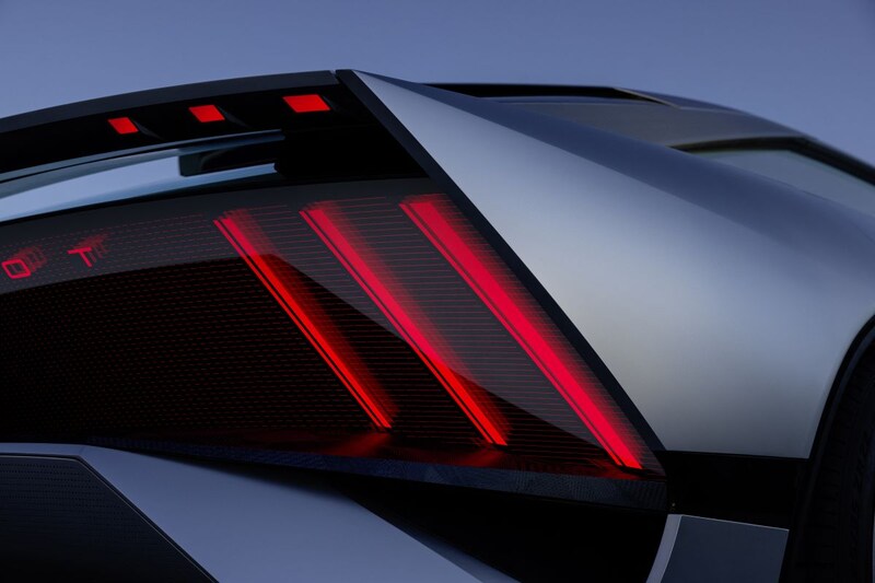 Centraal in de volledig verlichte maar dichte 'grille' zit uiteraard het nieuwe Peugeot-logo, maar aan weerszijden ervan lopen drie horizontale strepen. Daarmee knipogen de Fransen waarschijnlijk naar de relatief platte en met horizontale lamellen gevulde grilles van modellen als de 205, 405 en 605. De oplopende lijn boven de 'koplampen' doet ons enigszins denken aan die van de 504 en 505.