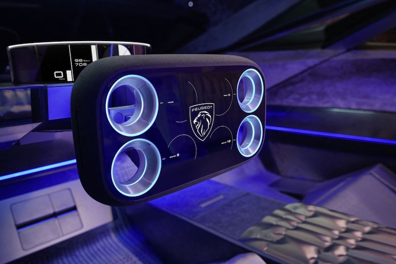 Minstens zo belangrijk is het interieur van Peugeots toekomstvisie. Daarin debuteert een wel heel futuristische doorontwikkeling van de bekende i-Cockpit, waarin het rechthoekige stuurwiel met grote ronde gaten als het ware met verkeerd geplaatste bekerhouders centraal staat. Het Hypersquare geheten stuurwiel fungeert direct als middel om nagenoeg alle functies mee te bedienen. Conventionele druktoetsen vind je niet en ook voor aanraakgevoelige is geen rol weggelegd. Centraal in het stuurwiel zit een display waarmee je alle functies eenvoudig moet kunnen bedienen. In zekere vorm keert dit Hypersquare-stuurwiel terug in een nieuw model, durft Peugeot al te beloven.