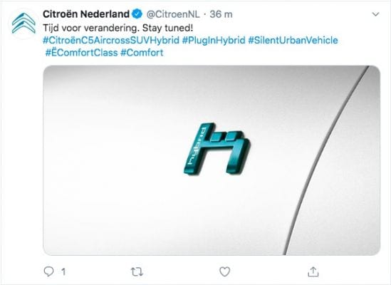Een nieuwe teaser op social media geeft aan dat we niet lang meer hoeven te wachten. ‘Tijd voor verandering’, zegt Citroën zelf. Op de meegestuurde foto zien we een nieuw logo, waarbij een grote ‘H’ van vermoedelijk ‘Hybrid’ de hoofdrol speelt. Verder gebruikt het merk hashtags ‘Plug-in Hybrid’ en ‘Silent Urban Vehicle’. Ook ‘Ë Comfort Class’ komt voorbij.