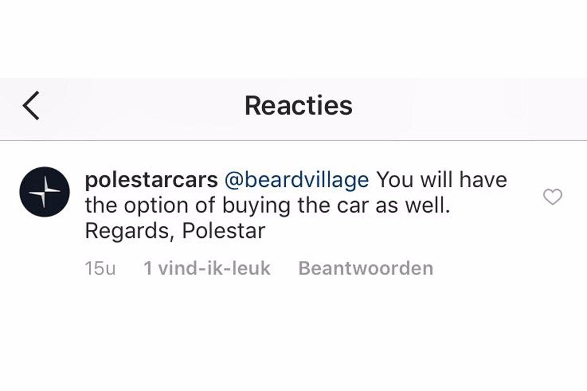 In het persbericht gisteren lazen we dat Polestar ervoor kiest om geen regulier verkoopmodel te hanteren. Modellen van het merk zouden online te bestellen zijn op basis van een twee- of driejarig abonnement. Dit zorgde voor veel vragen, ook op Instagram. Want is de Polestar dan helemaal niet 'los te koop'? Het merk laat zelf in een reactie op de foto weten dat dit niet het geval is: er komt een optie om de nieuwe Polestar gewoon te kopen. Over de prijs is verder nog niets bekendgemaakt.