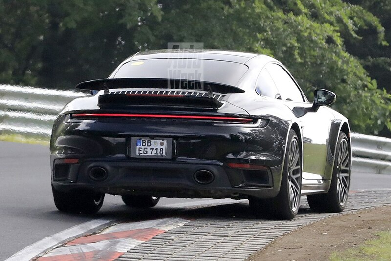 Dat het zo te zien op deze spionagefoto's om een 911 Turbo gaat, voedt de geruchten dat de eerste voor het brede publiek bestemde hybride 911 naar de naam 911 Turbo E-Hybrid luistert. Geen mild-hybride maar een volwaardige hybride. Dat voegt uiteraard het nodige gewicht toe, al gaan we ervan uit dat Porsche dat met een flink hoger vermogen dan bij de reguliere Turbo wel meer dan goedmaakt. De 580 pk van de reguliere 911 Turbo wordt ongetwijfeld flink overtroffen en ook de Turbo S met z'n 650 pk moet waarschijnlijk het onderspit delven. We zijn benieuwd.