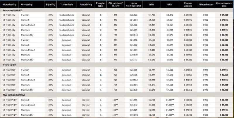 | 1.6 T-GDI MHEV 48v | Handgeschakeld (iMT6) | Voor | Premium Sky | € 43.295 |