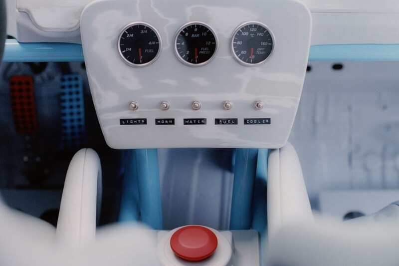 Dan het interieur, want ook dat heeft een heftige metamorfose ondergaan. Alle fraaie materialen zijn van het dashboard getrokken en de portieren moeten het zonder mooi afgewerkte panelen doen. Sterker nog, er zijn überhaupt geen deurpanelen te vinden. Op de plek waar je normaal gesproken een uitgebreid digitaal instrumentarium vindt, heeft de Project Geländewagen eenvoudige analoge klokken. Het stuurwiel is duidelijk ontworpen met het stuurwiel van een F1-wagen in het achterhoofd. Opvallend zijn de babyblauwe vijfpuntsgordels. Die blauwe kleur kom je net als knalrode details overal in de Project Geländewagen tegen. Zijn er productieplannen? Welnee, de witte G-klasse is puur het resultaat van een kleurrijke uitspatting, en misschien maakt juist dat dit compleet mesjogge gevaarte wel zo leuk.