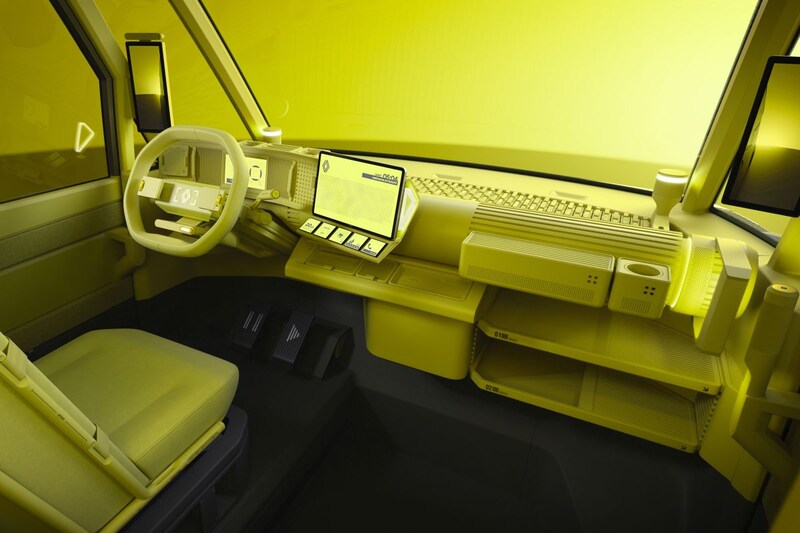 Het interieur van de Estafette Concept is kanariegeel en bevat slechts één vaste stoel. Die is voor de bestuurder. Ernaast vind je een opklapbare stoel voor de bijrijder, maar dient volgens Renault slechts trainingsdoeleinden. De bestuurdersstoel is draaibaar, de cabine hoog genoeg om in te staan. Handig! Verder zien we een 7-inch digitaal instrumentarium en een 12-inch infotainmentdisplay. Op twee 10-inch displays aan weerszijden van het interieur worden de beelden getoverd die de als zijspiegels fungerende camera's schieten.