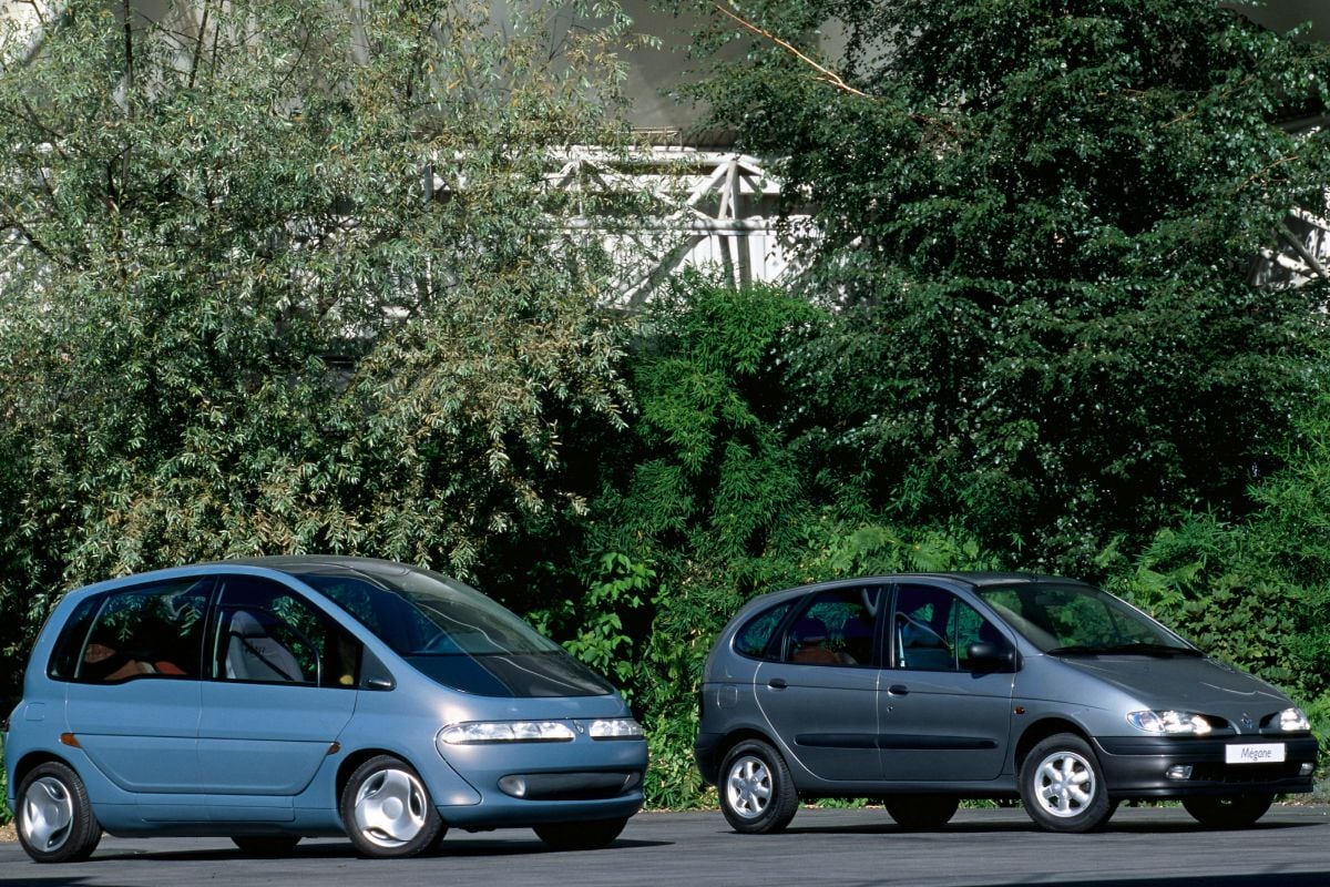 De conceptauto en de, toen nog Mégane Scénic geheten, eerste generatie van de Scénic.