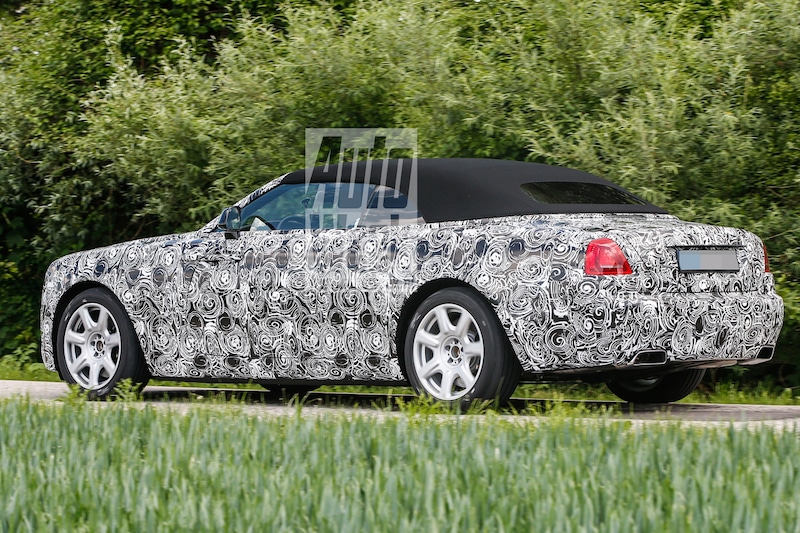 We zien de stoffen kap nu compleet zonder stickerwerk, maar daar is het meeste ook wel mee gezegd. Rolls-Royce kon al bevestigen dat de Dawn begin volgend jaar in de showrooms te vinden zal zijn. We verwachten derhalve dan ook later dit jaar een officiële onthulling.