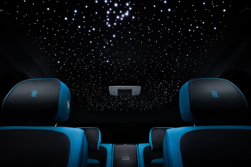 De Ghost Black Badge staat op 21-inch wielen die zijn opgebouwd uit 44 lagen koolstofvezel en heeft niet alleen minder glanzend chroom, maar ook een donkerder uitgevoerde grille met erop een evenzo sinister ogende Spirit of Ecstacy. Natuurlijk kun je ook voor de uitvoering van het interieur alle kanten op. Rolls-Royce biedt een enorme reeks materialen en kleurcombinaties, waaronder het blauwzwarte interieur dat je op deze platen zien.