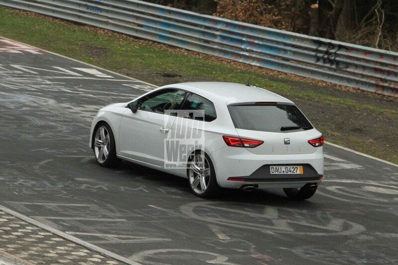 Als fabrikant van sportieve modellen ontkom je er niet aan om je producten op de Nordschleife te testen. Een Leon FR zou dan ook eigenlijk niet zo opvallend moeten zijn. Maar deze specifieke FR heeft een paar details die niet helemaal kloppen. De forse dubbele uitlaten aan de achterkant bijvoorbeeld, om over de dikke Brembo remmerij met rood gespoten remklauwen nog maar te zwijgen. Volgens onze spionagefotograaf produceert dit exemplaar bovendien een zwaar, donker motorgeluid wat volgens hem wijst op een vrij grote motor met sowieso 2,0-liter inhoud. Alle reden dus om te denken dat we hier met een testexemplaar van de Cupra te maken hebben. Blijkbaar komt de sportiefste aller Leons er voortaan ook als driedeurs.