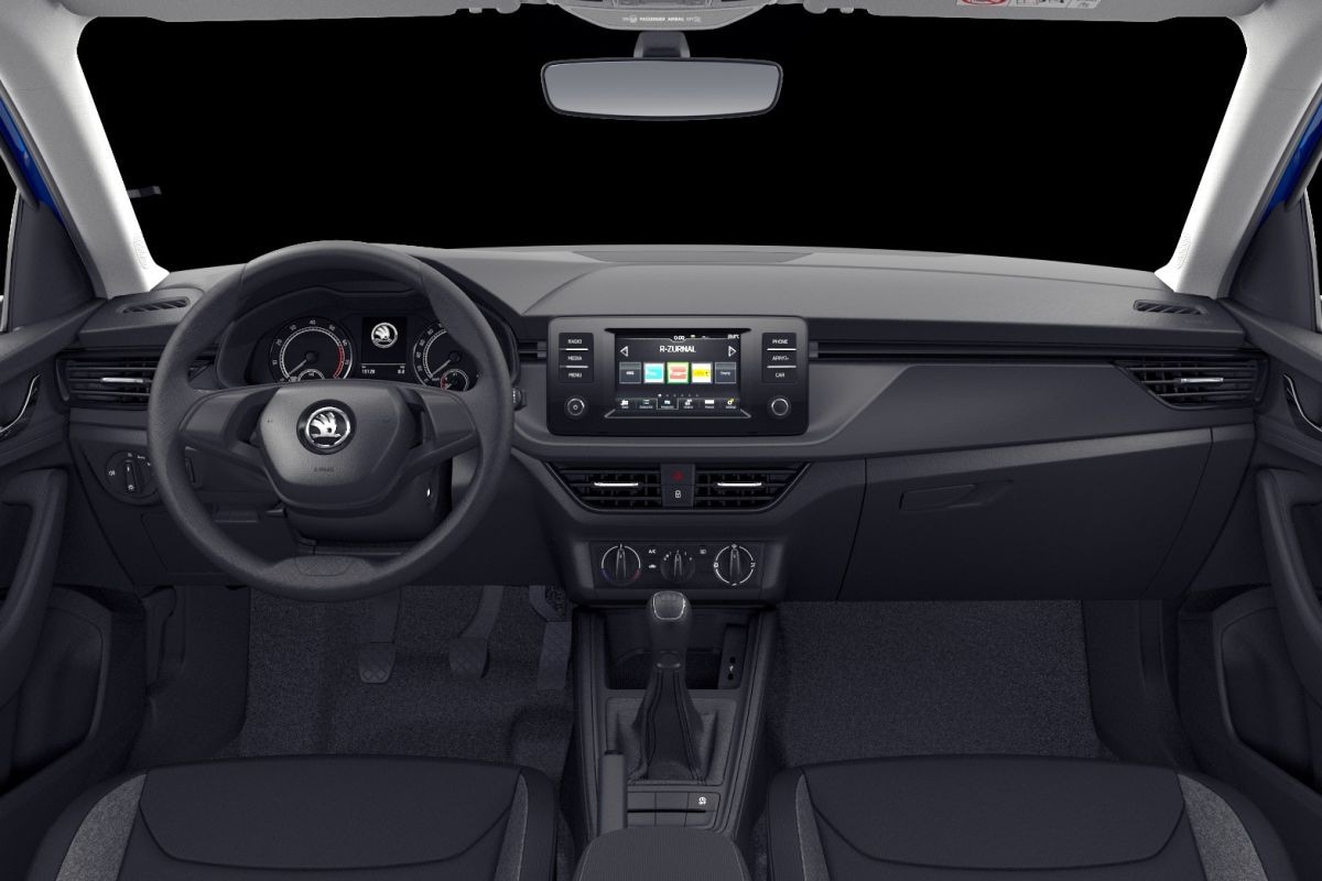 Wat geen opties zijn, zijn een handmatig bediende airco, een audiosysteem met vier speakers en de mogelijkheid je telefoon te verbinden via Apple CarPlay of Android Auto - maar niet via Bluetooth (!). Het systeem bedien je met een 6,5-inch touchscreen te midden van een verder wel erg zwart interieur. Zelfs het tweespaaks stuurwiel kent geen enkel contrasterend stripje en draagt bovendien geen enkel knopje. De standaardstoelbekleding is zwarte stof en als bestuurder vind je voor je neus nog gewoon analoge tellers.