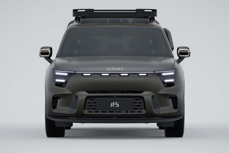 Het uiterlijk van de Smart #5 is bepaald geen verrassing meer, want eerder dit jaar konden we 'm je al laten zien. Bovendien lijkt de #5 behoorlijk op de conceptversie die eerder dit jaar werd gepresenteerd. Duidelijk is in elk geval dat de fabrikant niet gaat voor een familiegezicht, want de #5 bewandelt wat dat betreft een heel ander pad dan kleinere broers Smart #3 en Smart #1. Hij is ontworpen door Mercedes-Benz, dat naast Geely nu nog voor de helft eigenaar is van het merk. Het is een behoorlijk hoekig ogend model naast de andere Smarts, met hier en daar een avontuurlijk accentje. Smart laat ook meteen zien dat de #5 naar wens nog avontuurlijker aan te kleden is, onder meer met, treeplanken, extra bodembescherming en een imperiaal met een laddertje om op het dak te kunnen komen.