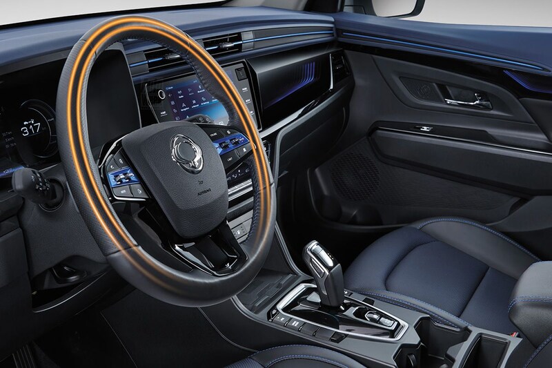 De vormgeving van het interieur van de Korando e-Motion is niet anders dan bij de reeds bekende versies. Wel zien we ook hier blauwe accenten, onder meer in de ventilatieroosters, op het stuurwiel en op de deurpanelen. Ook de stiksels van de stoelen en de middenarmsteun zijn in het blauw uitgevoerd. De bagageruimte van de elektrische Korando e-Motion bedraagt 551 liter en is daarmee niet kleiner dan die van de niet-elektrische Korando. Leuk weetje: de Korando e-Motion aan- of uitzetten activeert een geluidsopname waarmee de Korando je welkom heet of gedag zegt. Sympathiek. SsangYong levert de Korando e-Motion onder meer met intelligente adaptieve cruisecontrol, automatisch grootlicht, een actieve rijbaanassistent en voorzieningen als dodehoekdetectie en Rear Cross Traffic-Collision Assist.