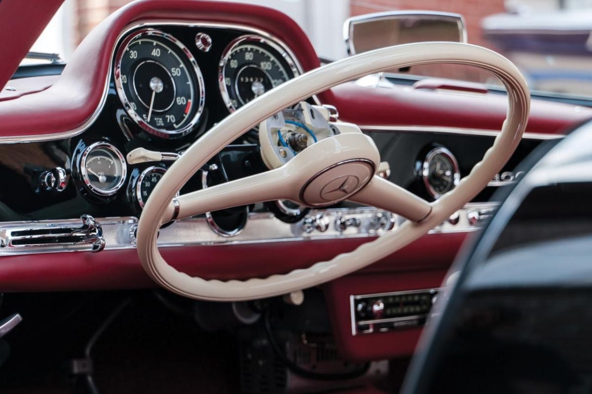 Om het in- en uitstappen te vergemakkelijken, kan je het stuur van de Gullwing naar beneden klappen. Een slimme vondst, die echter nooit navolging krijgt.