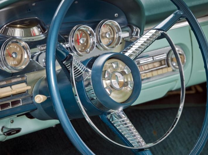Oude Amerikaanse stuurwielen zijn vaak kunstwerken op zich. Edsel, het mislukte submerk van Ford, clustert de drukknoppen voor de automaat in het hart van het stuur.
